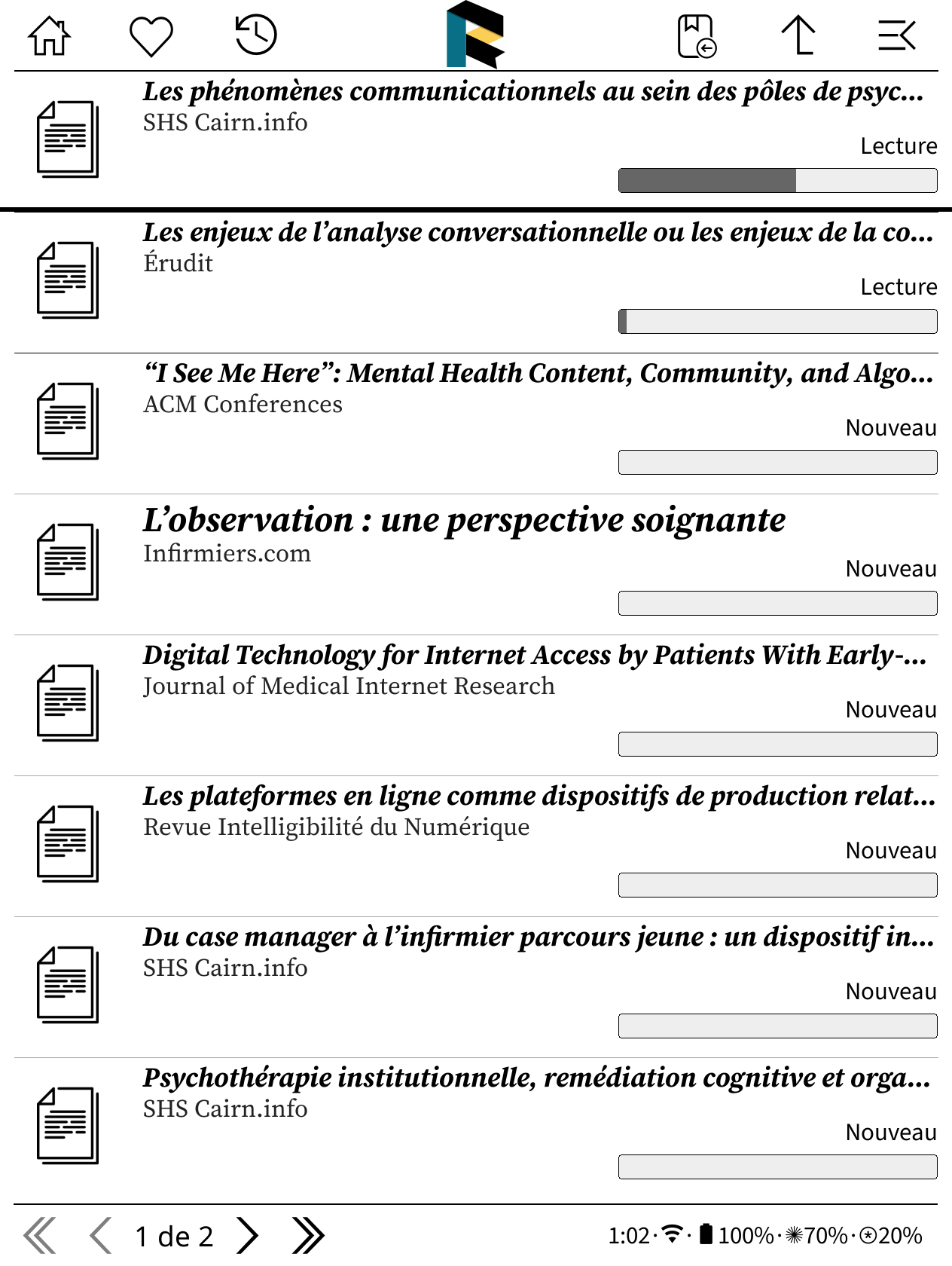 À première vue, il pourrait sembler secondaire, mais il il rend crédible l’idée même d’un verso de la liseuse. Il organise améliore l’interface native de KOreader (qui est une catastrophe en ergonomie) pour organiser la bibliothèque. Ce mode place en haut de la liste les articles qu’on a déjà commencé à lire, et affiche une barre de progression. Vous pouvez, comme moi, remplacer dans les dossiers de koreader le logo hero.svg par le logo de Readeck.